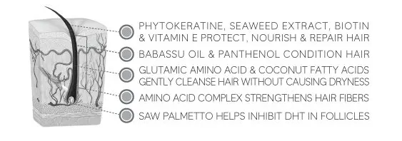 - Biotin: Improves the hair’s natural barrier function and reduces trans-epidermal water loss to maintain scalp hydration.
